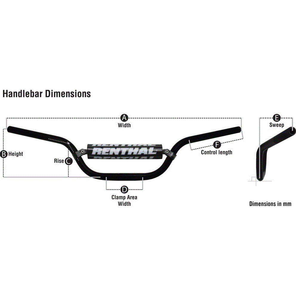 Una esclusiva lega di alluminio rende i manubri Renthal 7/8 il 20% più resistenti di qualsiasi altro manubrio tanto che sono stati scelti come primo equipaggiamento dalle case motociclistiche Honda e Kawasaki. Diametro a(775mm), diametro b(92mm), diametro c(64mm) diametro d(115mm) diametro e(49mm) diametro f(196mm).